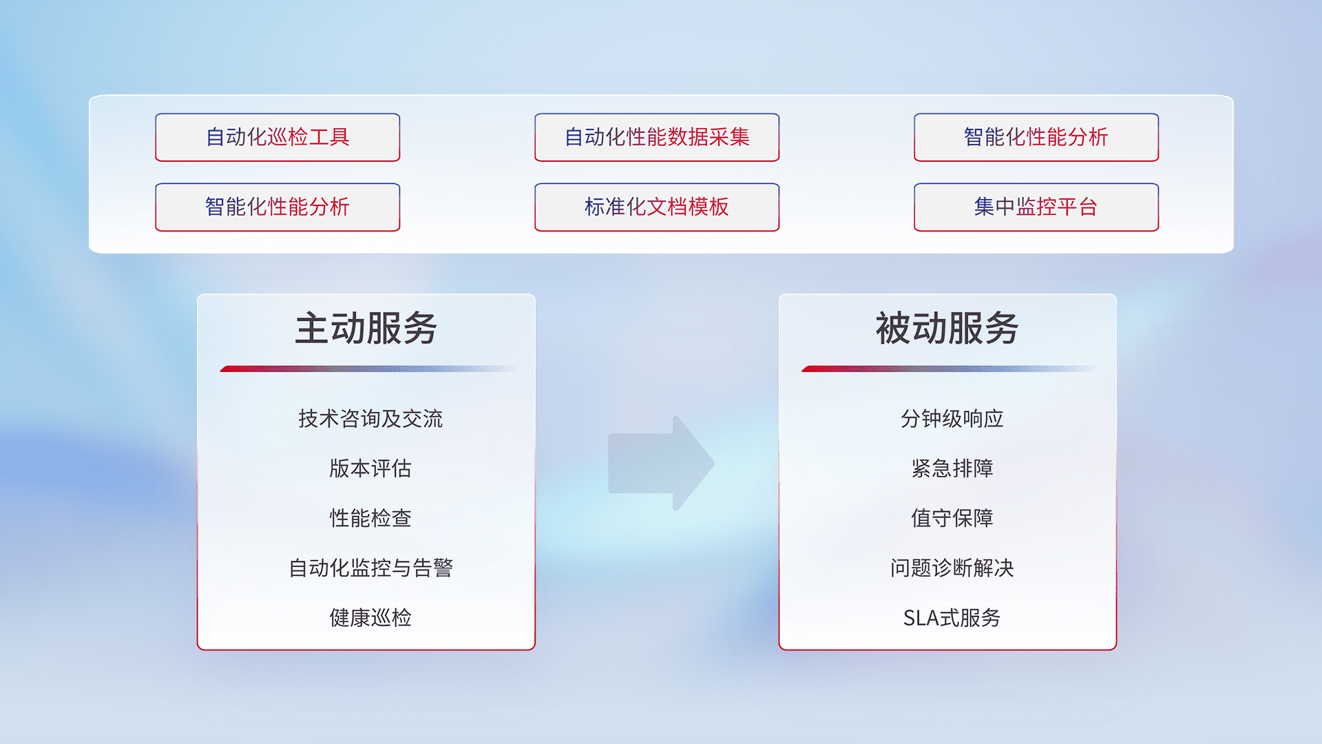 智能化工具和标准化文档,,保障服务质量,,提供主动服务(包含技术咨询、、、版本评估、、性能检查、、自动化监控与告警、、、健康巡检)和被动服务包含(分钟级响应、、紧急排障、、、、值守保障、、、问题诊断解决、、、SLA服务)。。