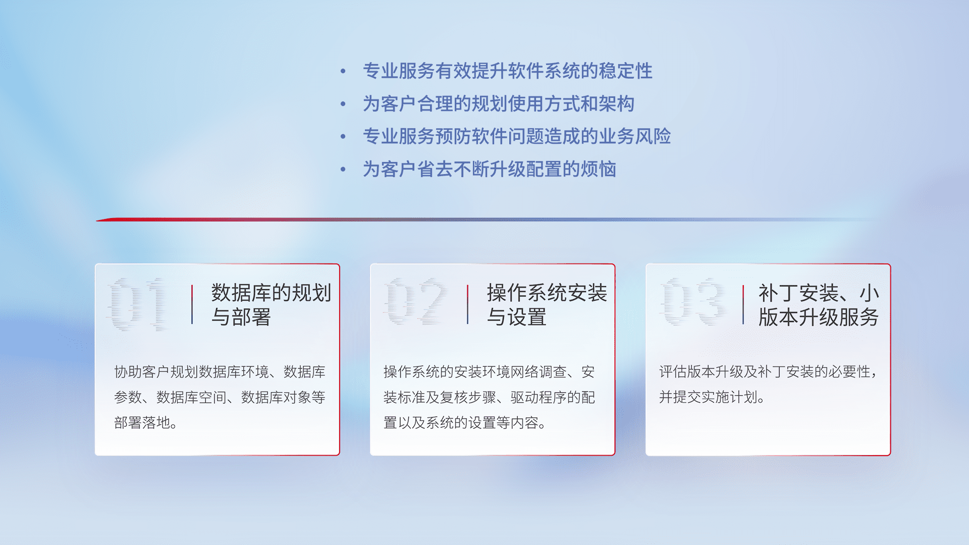 为客户提供软件规模升级、、、、快速部署、、、、按需配置的专业服务,,,,从数据库的规划与部署到操作系统的安装与设置,,,,再到补丁安装和小版本升级提供支持。。。