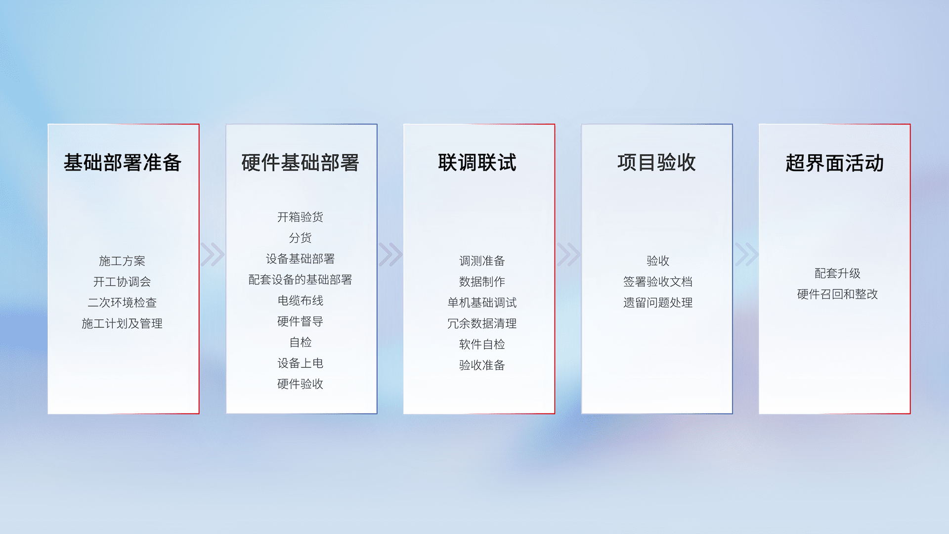 从基础部署准备、、、、硬件基础部署、、、联调联试、、项目验收、、、越界面活动的全过程可追溯,,,,保证施工质量和进度。。
